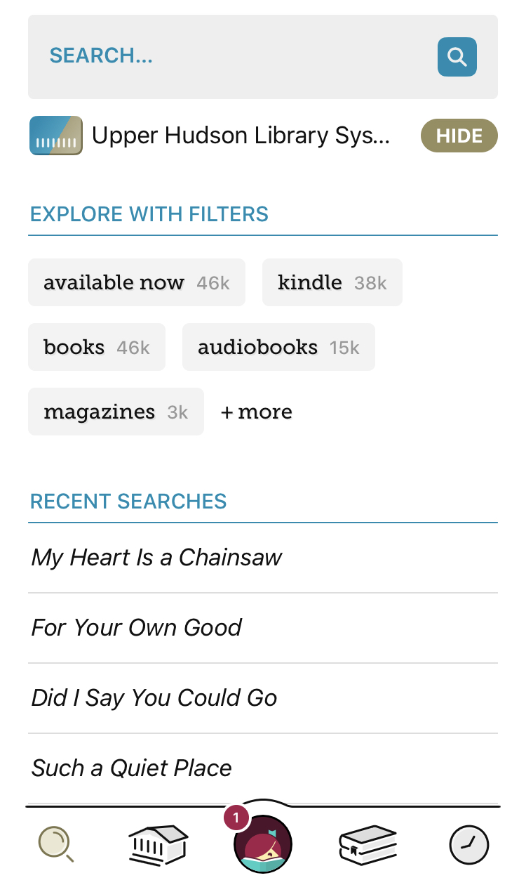 Notifications: A badge icon with a number will display if you have any notifications, which includes if there are titles ready to borrow or if a hold placed has not been borrowed in time and has expired.