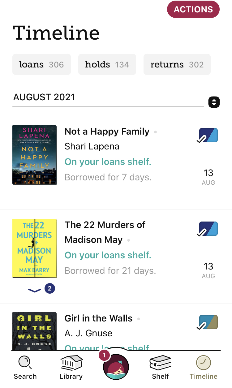 Timeline: Shows your recent activity on Libby: items borrowed, items returned, holds placed, and other Libby activity.